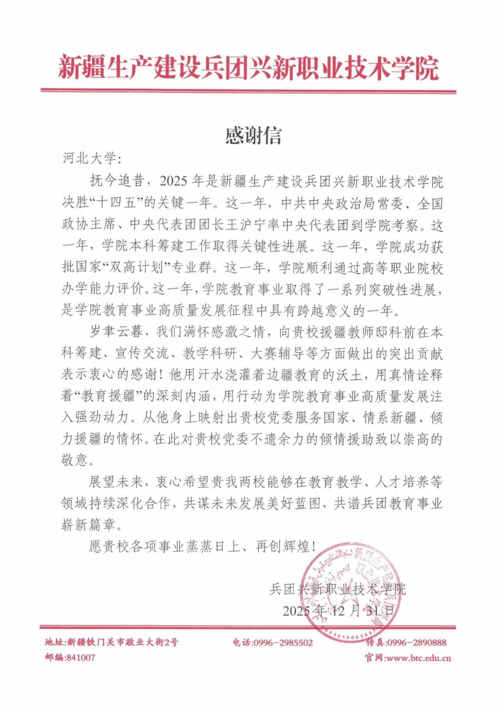 感谢信中指出,2025年是兴新职业技术学院实现跨越式发展的关键之年,学院在“双高计划”专业群建设、办学能力评价、本科筹建等方面取得突破性进展。邸科前老师与我校其他援疆教师一道,用实际行动诠释了教育援疆的使命担当,展现了河北大学教师服务国家战略、支持边疆教育发展的奉献精神。