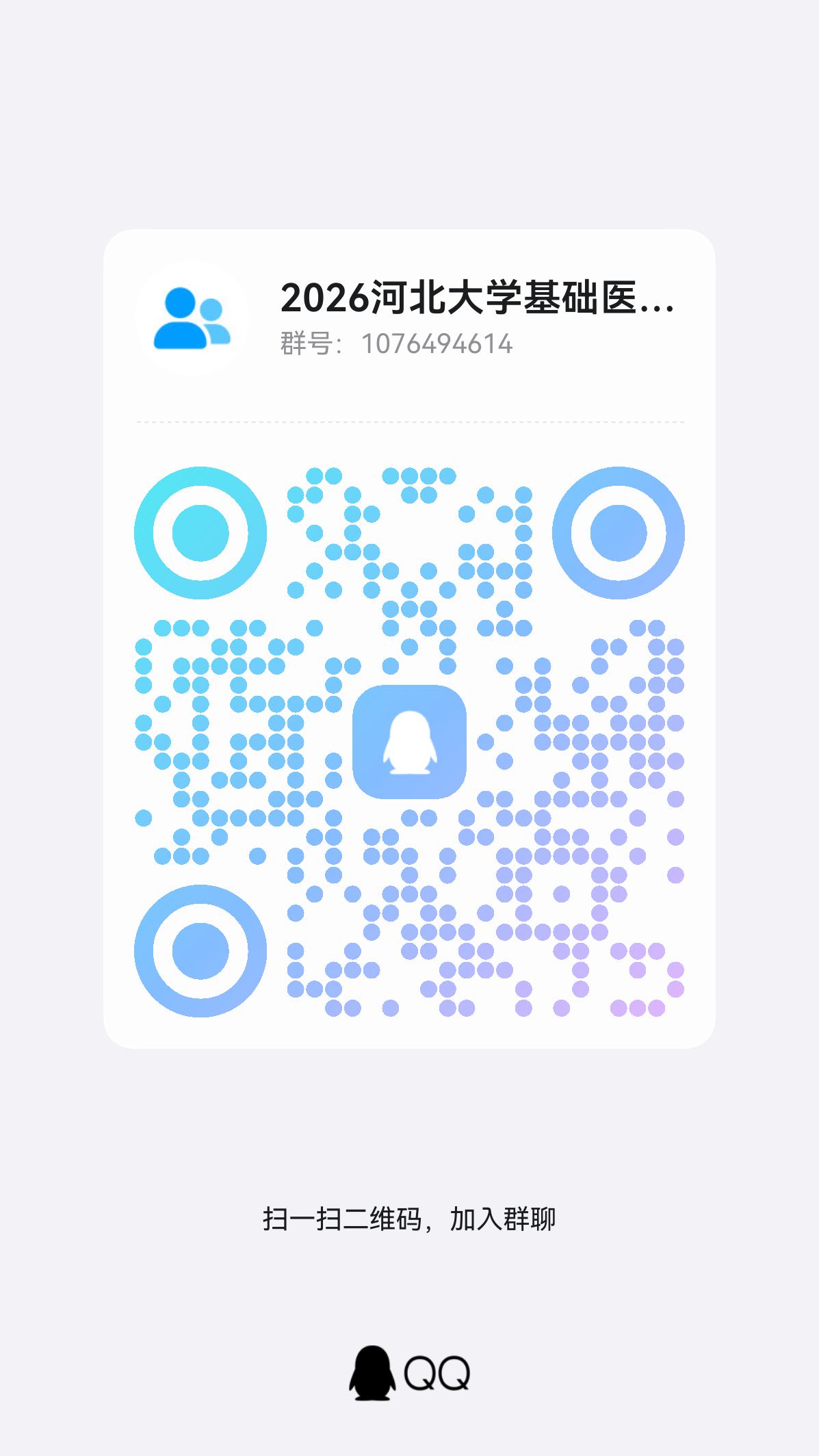 我院近期将开展基础医学(专业代码:100100)硕士研究生招生第二次调剂工作,有意参加二次调剂的考生请扫描图中二维码,加入QQ群(群号:1076494614)。